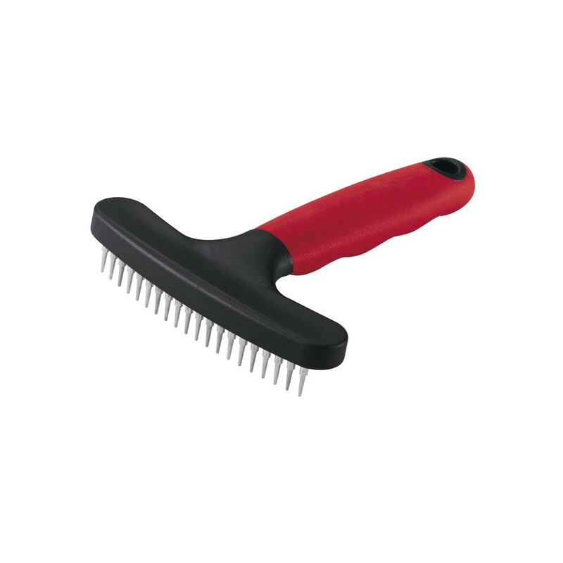 Deshacer los nudos del manto de tu perro ya no será un problema gracias a este rastrillo de púas cortas. Aconsejado para el cuidado del submanto de los animales de pelo medio o largo, posee una empuñadura ergonómica para un agarre seguro y púas redondeadas para la máxima delicadeza en el manto de tu perro.