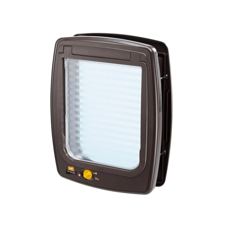 Dotada con sistema de cierre de 4 vías que permite seleccionar el modo de funcionamiento de la puerta: solo salida, solo entrada, entrada y salida, bloqueo total (el animal no puede entrar ni salir). La gatera dispone de un sistema especial de protección contra corrientes de aire que impide que estas se cuelen en casa. También presenta un túnel completo extensible que permite aplicarla en puertas de mayor espesor.